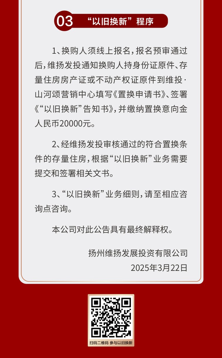 為進一步滿足更廣泛客群對于更高居住品質、更美好生活的改善需求,維投地產公布了“以舊換新”3.0版本,將維投·山河序也納入置換范圍,預計本周五(5月23日)正式啟動置換流程,同時接受預約登記。